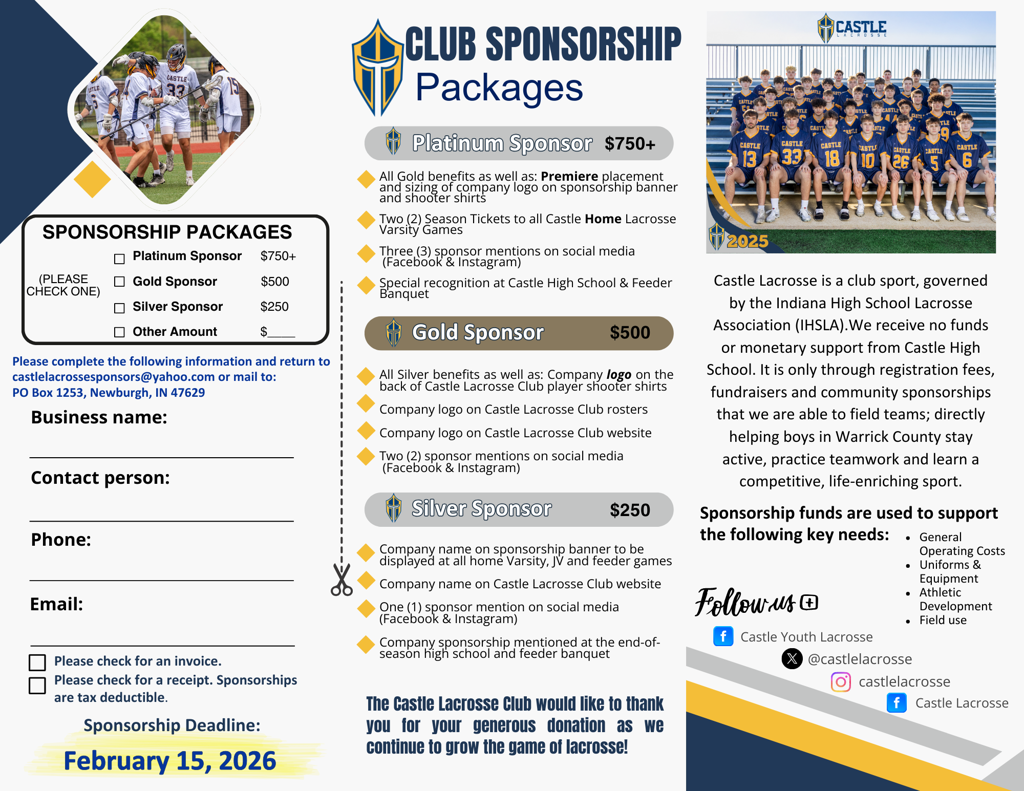 Founded in 2009, the Castle Lacrosse Club is a 501(c)3 organization dedicated to promoting the growth and experience of lacrosse. Having grown from 15 boys, in our first season, to over 110 boys this year, Castle Lacrosse Club now fields high school, middle school and youth teams, competing against teams throughout Indiana.